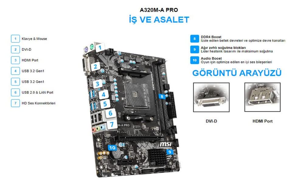 MSI A320M-A PRO AM4 DDR4 3200(OC) DVI HDMI USB3.2 mATX Anakart
